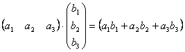 Таким образом, например, чтобы получить у произведения (т.е. в матрице C) элемент, стоящий в 1-ой строке и 3-м столбце c13, нужно в 1-ой матрице взять 1-ую строку, во 2-ой – 3-й столбец, и затем элементы строки умножить на соответствующие элементы столбца и полученные произведения сложить. И другие элементы матрицы-произведения получаются с помощью аналогичного произведения строк первой матрицы на столбцы второй матрицы. В общем случае, если мы умножаем матрицу A = (aij) размера m × n на матрицу B = (bij) размера n × p, то получим матрицу C размера m × p, элементы которой вычисляются следующим образом: элемент cij получается в результате произведения элементов i -ой строки матрицы A на соответствующие элементы j -го столбца матрицы B и их сложения. Из этого правила следует, что всегда можно перемножать две квадратные матрицы одного порядка, в результате получим квадратную матрицу того же порядка. В частности, квадратную матрицу всегда можно умножить саму на себя, т.е. возвести в квадрат. Другим важным случаем является умножение матрицы–строки на матрицу–столбец, причём ширина первой должна быть равна высоте второй, в результате получим матрицу первого порядка (т.е. один элемент). Действительно,
