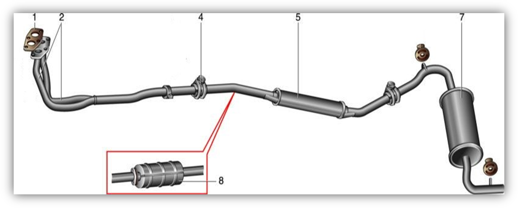 1-уплотнительная прокла дка, 2-приёмная труба, 4-промежуточное соединение, 5-резонатор, 7-глушитель, 8-каталитический нейтрализатор.