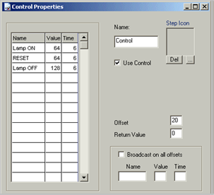 5. В области Return Value введите возвратные значения. Иногда, возвращаемые значения называется безопасными значениями. Возвращаемое значение обычно 0. 6. В столбце Name введите имя шагов, такие как: Лампа ON, Reset, Лампа OFF. 7. В столбце Value (значение), заполните значения шага в DMX. Например: DMX-значения для приборов Martin " Lamp ON на 228; DMX значение для приборов High End: Reset на 64. 8. В столбце Time введите время в секундах для удержания этой команды. Это обычно 6 секунд.
