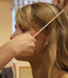 Достаточно приложить расческу к линии подбородка. Если прическа низкая, то пучок должен находиться не выше прямой линии, проведенной от подбородка к шее. Если высокая - то на диагонали, проведенной от подбородка к макушке, точно через верхнюю точку уха. "Офелия" Эта прическа особенно хорошо подойдет девушкам с круглым (дополнительно можно зачесать волосы от ушей к макушке), треугольным (дополнительно можно добавить прядей на лоб и боковых прядей) и, конечно же, овальным лицом. Не создавая большого объема вверху, она хорошо будет смотреться в паре с небольшой разницей в росте и отлично вытянет "шейповую" линию от мысочка ноги и до самой макушки. Наша прическа – низкая, а значит, пучок будет расположен не выше линии подбородка. Теперь, когда мы определили расположение прически, необходимо отделить пряди для украшения челки. Для этого для начала находим линию пробора. В данной причёске пробор - диагональный, поэтому его линия будет проходить по диагонали от середины брови к макушке. Когда пробор найден, остается отделить верхнюю зону волос аккуратным треугольником. Найти этот "бермудский" треугольник (а точнее, второй его катет) - легко. И в этом нам опять поможет расческа. Время перед конкурсом дорого, и чтобы не тратить его на размышления о том, где именно сегодня будет находиться наша чёлка, мы просто находим ухо, приставляем к его верхней точке расческу и проводим линию наверх, прямо до пробора.