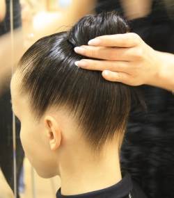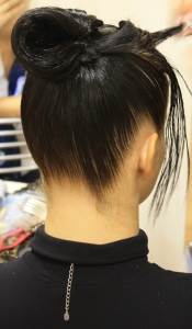 Следующий этап – это хвост. Он является основой любой, даже самой сложной прически. Хвост должен быть очень крепким, ведь именно от него зависит, как хорошо будет держаться прическа во время конкурса. Чтобы справиться с непослушными локонами, для начала покрываем волосы гелем (исключая, разумеется, чёлку) и сушим феном. Потом, с помощью двусторонней расчески и специальной резинки с двумя крючочками на конце собираем волосы на затылке. Чтобы резинка не была заметна (а вдруг она атипично красная!), скрываем ее под волосами, обворачивая вокруг волос прядь и закрепляя ее невидимкой.