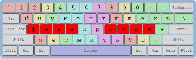 На рисунке приведена схема русской клавиатуры. Схема дает представление о зонах движения соответствующих пальцев к нужным клавишам, приучает к слепому методу письма десятью пальцами. Особое внимание учащихся следует обратить на расположение пальцев на клавишах основного ряда (см. рисунок):