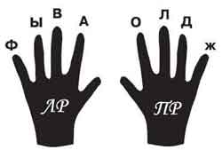 · левая рука: мизинец — ф, безымянный — ы, средний — в, указательный — а; · правая рука: указательный — о, средний — л, безымянный — д, мизинец — ж. · к левому указательному пальцу — а, п, к, е, м, и; · к правому указательному — о, р, н, г, т, ь; · к левому среднему — у, в, с; · к правому среднему — ш, л, б; · к левому безымянному — ц, ы, ч; · к правому безымянному — щ, д, ю; · к левому мизинцу — й, ф, я; · к правому мизинцу — з, ж, э, х, ъ. · большими пальцами обеих рук нажимают на клавишу пробела. На начальном этапе обучение слепому десятипальцевому методу печати проводится без учета регистра. Регистры, знаки препинания, цифры, вспомогательные символы — это уже следующий этап, к которому можно переходить, овладев навыком слепой десятипальцевой печати в нижнем регистре (строчными буквами). Практика показывает, что их изучение занимает не более 5-10% времени, потраченного на изучение нижнего регистра клавиатуры. Да и расположение их на разных клавиатурах, в разных операционных системах различно. Прежде чем приступить к освоению набора текстов на русском языке, обратите внимание учащихся на следующие клавиши: Backspace, Delete, Enter, Space.