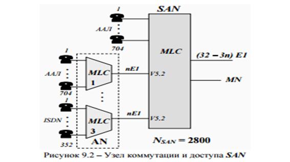 SAN(Switch Access Node) рұқсатының және түйін коммутациясы аз сыйымдылықты толықфункциялы жүйені құрайды. Бір уақытта түйін коммутация функциясын және түйін байланыс рұқсатнамасын орындайды. Бір SAN қызмет атқаратын абоненттер саны 2800-ден 4000 абонентке дейін жетеді. Бұл түйіннің аппаратты платформасы болып сызықты модуль MLC программалық қамтамасыз ететін автономды станция болып келеді. Бір SAN-ға MLC модульін қолданғанда максималды түрде 704 ААЛ(локальді) дейін - 32 трактар Е1 –ға дейін станцияаралық байланысын ұйымдастыру және байланыс рұқсатнамасының түйінін қосу; - 3-ке дейін стандартты түйін рұқсатнамасын (AN), әрбір сыйымдылықпен 320-дан 704 ААЛ дейін қосуға болады. AN түйін рұқсатнамасын қосу үшін 3-4 тракты Е1 қолданылады. Қондырылған программалық қамтамасыздандыруға байланысты коммутация түйіні және рұқсатнамасы – кеңжолақты немесе сымсыз түйін коммутациясы мен рұқсатнамасы ретінде қолдануы мүмкін. SAN басқару MN түйін басқармасымен жүзеге асады.
