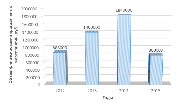 Рисунок 1 – Количество граждан категории молодёжь в общей численности населения города Липецка. Следовательно, в городе происходит сокращение численности молодых граждан. В 2013 году по сравнению с 2012 годом количество молодёжи города сократилось на 3416 человек с 121909 человек до 118493 человек. В 2014 году по сравнению с 2013 произошло сокращение молодого населения в городе на 4500 человек (с 118493 человек до 113 993 человек), что на 1084 человека больше чем за предыдущий период. Прогнозируя показатель численности населения города категории молодёжь используя метод Простого экспоненциального сглаживания, можно сказать, что произойдёт дальнейшее сокращение и в 2015г. численность данной категории граждан может составить 21,9% от численности населения города. Это обусловлено оттоком молодёжи в центральные регионы Российской Федерации. Объемы финансирования программных мероприятий в 2013 году увеличились на 38% по сравнению с 2012 годом и составили 1 400 000 рублей. В 2012 году объём финансирования составил 868 000 рублей. Объём финансирования программных мероприятий в 2014 году увеличился на 31,4% по сравнению с 2013 годом и составил 1 840 000 рублей. Финансирование мероприятий осуществляется за счет средств, выделенных администрации города Липецка на реализацию городских целевых программ «Молодёжь города Липецка (2013-2015 годы)», «Липецк – наш общий дом (2013-2015 годы)». Объём финансирования программных мероприятий в 2015 году составил 800 000 рублей, что по сравнению с 2014г. ниже на 57%. (рисунок 2). Таким образом, объём финансирования программных мероприятий в 2015 году находятся на уровне ниже 2012 года, что является негативной тенденцией для нашего города. Данная тенденция обусловлена направлением денежных потоков на развитие инфраструктурной отрасли города.