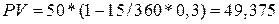 Из приведенных формул видно, что величина дисконта пропорциональна времени и ставке дисконтирования. Естественно, что чем выше значение ставки дисконтирования, тем большую сумму удержит банк в свою пользу. Учет векселя чаще всего осуществляется способом 365/360. Пример. Векселедержатель предъявил 13.09 для учета вексель на сумму 50 тыс. руб. со сроком погашения 28.09. Банк согласился учесть вексель по учетной ставке 30% годовых. Определить сумму, которую векселедержатель получит от банка.