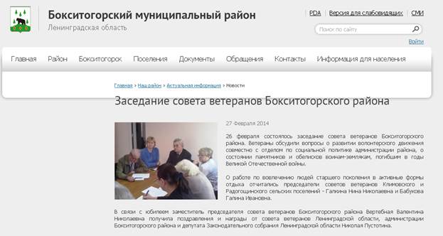 Глава администрации района Сергей Мухин провел заседание оргкомитета по подготовке и проведению мероприятий, посвященных 70-й годовщине Победы в Великой Отечественной войне. В ходе совещания был подробно рассмотрен и утвержден план мероприятий с указанием конкретных сроков и ответственных лиц по подготовке и проведению празднования 70-й годовщины со Дня Победы в Великой Отечественной войне на территории района. В частности, рассматривались вопросы по благоустройству населенных пунктов района и праздничному оформлению города Бокситогорска к Дню Победы, по награждению ветеранов юбилейными медалями "70 лет Победы в Великой Отечественной войне 1941 - 1945 гг.", по организации подготовки акции "Бессмертный полк". Члены оргкомитета обсудили также ремонт мемориала в д. Астрачи, на который предусмотрены средства в размере 748 тыс. руб. Сергей Мухин дал поручение отделу по строительству администрации района подготовить конкурсную документацию и 12 февраля 2015 года объявить конкурс на выбор подрядной организации для проведения ремонта Астрачинского мемориала со сроком завершения работ 30 апреля. По поводу ремонтных работ на территории Братского захоронения в г. Бокситогорске принято решение в течение 2015 года провести замену системы газификации "Вечного огня", а также ремонт скульптуры солдата. Администрациям городских и сельских поселений района даны поручения до 30 апреля на выделенные из бюджета района средства организовать и провести ремонтные работы воинских захоронений и памятников, расположенных на территориях поселений.