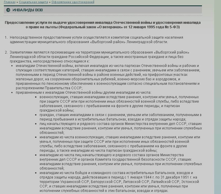 2) льготы для ветеранов выборгского района: 1) http://www.vbglenobl.ru/kszn/oformlenie-udostovereniy/invalidy-vov 2) Предоставлении услуги по выдачи удостоверения члена семьи погибшего (умершего) инвалида войны, участника Великой Отечественной войны, ветерана боевых действий. (Федеральный закон «О ветеранах» от 12 января 1995 года № 5-ФЗ)