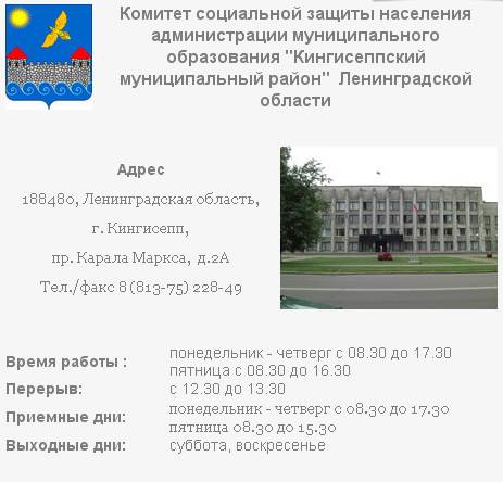 администрации муниципального образования "Кингисеппский муниципальный район" Ленинградской области (http://social.kingisepplo.ru/) Адрес электронной почты: kszn-king@mail.ru