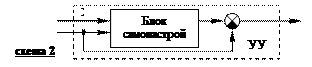 ИУ – исполнительное устройство. X – управляющее (задающее) воздействие. Y – корректирующее воздействие. дт1, дт2 – датчики. Это схема с обратной связью, или, что то же, с управлением по отклонению (по ошибке). Датчик 2 контролирует качество управления. Исполнительное устройство может содержать в себе другую (подчинённую) систему управления. И таких подчинённых вложений может быть несколько. Если возмущение, поступающее со стороны окружающей среды на датчик 1 по величине постоянно (он может быть просто тумблером включения-выключения), то это система регулирования. Но это возмущение может быть меняющимся во времени. И система управления должна это отслеживать. Такие системы называются следящими. Они управляют перьями самописцев, копировальными станками, локаторным наведением ракет и многим прочим. Есть ещё класс систем, которые называются самонастраивающимися. Они применяются тогда, когда параметры настройки заранее не известны, или меняются со временем, или настройка очень трудоёмка. Широко известным примером самонастраивающейся системы является автоматическая подстройка частоты: АПЧ радиоприёмника или телевизора. Это пример так называемой поисковой самонастраивающейся системы. Есть и беспоисковые (быстродействующие). Поисковые системы содержат специальный функциональный блок, который по определённому алгоритму меняет параметра настройки, следя при этом за производимым эффектом. Например, АПЧ постепенно увеличивает частоту приёма, следя при этом за мощностью принимаемого полезного сигнала. Когда полезный сигнал начнёт ослабевать, АПЧ начнёт уменьшать частоту приёма. Когда сигнал, перейдя максимум мощности, снова начнёт ослабевать, АПЧ снова начнёт увеличивать частоту приёма, но уже медленнее, и так далее, до тех пор, пока в соответствии с каким-то критерием будет принято решение, что лучшего не добиться, или, просто - ограничение по времени поиска. Изобразить на схеме это можно, добавив в схему 1 блок самонастройки. (Левый рисунок, являющийся частью схемы 1, меняем на правый.)