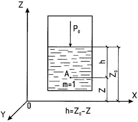 Правая часть уравнения при Рассмотрим наиболее общий случай равновесия жидкости, заключенной в сосуде, когда она находится в покое под действием силы тяжести и давления p0на свободной поверхности (рис. 2.7). В оси координат поместим жидкость, заключенную в сосуде, выделим в точке А частицу жидкости с массой m = 1.