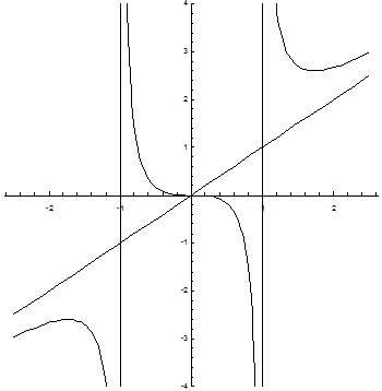 Находим область существования функции. Очевидно, что областью определения функции является область (-¥; -1) È (-1; 1) È (1; ¥). В свою очередь, видно, что прямые х = 1, х = -1 являются вертикальными асимптотами кривой. Областью значений данной функции является интервал (-¥; ¥). Точками разрыва функции являются точки х = 1, х = -1. Находим критические точки. Найдем производную функции