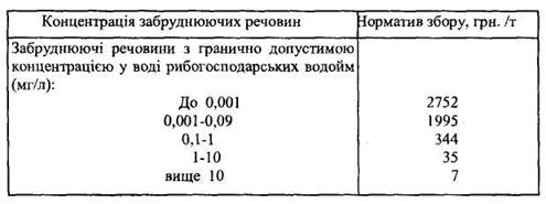 Нормативи збору за скиди залежно від концентрації забруднюючих речовин