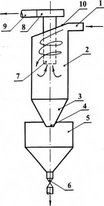 Ðèñ. 4.8. Öèêëîí: 1 — âõîäíîé ïàòðóáîê; 2 — öèëèíäðè÷åñêàÿ ÷àñòü êîðïóñà; 3 — êîíè÷åñêàÿ ÷àñòü êîðïóñà; 4 — ïûëåâûïóñêíîå îòâåðñòèå; 5 — áóíêåð äëÿ ïûëè; 6 — ïûëåâîé çàòâîð; 7 — âûõëîïíàÿ òðóáà; 8 — ðàñêðó÷èâàþùàÿ óëèòêà; 9 — âûõîäíîé ïàòðóáîê; 10 — íàêëîííàÿ êðûøêà Âðàùåíèå ãàçîâîãî ïîòîêà äîñòèãàåòñÿ ïóòåì åãî òàíãåíöèàëüíîãî ââîäà â öèêëîí èëè ïóòåì èñïîëüçîâàíèÿ ñïåöèàëüíîãî çàâèõðèòåëÿ.  ðåçóëüòàòå äåéñòâèÿ öåíòðîáåæíûõ ñèë ÷àñòèöû ïûëè, âçâåøåííûå â ïîòîêå ãàçà, îòáðàñûâàþòñÿ íà ñòåíêè êîðïóñà öèêëîíà è âûïàäàþò èç ïîòîêà. Î÷èùàåìûé ïîòîê ãàçà, îñâîáîæäåííûé îò ïûëè, ïðîäîëæàÿ âðàùàòüñÿ, èçìåíÿåò íàïðàâ- Ðàçäåë 4. Âîçäóøíàÿ ñðåäà ãîðîäà 201