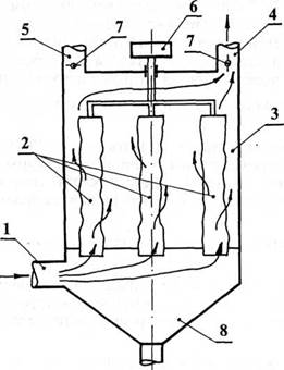 Ðåêîìåíäóåìàÿ ñêîðîñòü ãàçà â öèëèíäðè÷åñêîé ÷àñòè öèêëîíà — 2,5— 4,5 ì/ñ. Äèàìåòð öèêëîíà íå ñëåäóåò çàäàâàòü áîëåå 1000 ìì. Äëÿ ïîâûøåíèÿ ýôôåêòèâíîñòè î÷èñòêè öèêëîíû êîìïîíóþò â ãðóïïû ñ îáùèì ïîäâîäîì è îòâîäîì î÷èùàåìîãî âîçäóõà. Òàêèå öèêëîíû íàçûâàþò áàòàðåéíûìè. Ýòèì äîñòèãàåòñÿ ñóùåñòâåííàÿ ýêîíîìèÿ êàïèòàëüíûõ è ýêñïëóàòàöèîííûõ çàòðàò. Ê âûñîêîýôôåêòèâíûì òèïàì àïïàðàòîâ ñóõîé î÷èñòêè ãàçîâ îòíîñÿòñÿ ôèëüòðû.  îñíîâå ðàáîòû ôèëüòðîâ âñåõ âèäîâ ëåæèò ôèëüòðàöèÿ çàïûëåííîãî âîçäóõà ÷åðåç ïîðèñòóþ ïåðåãîðîäêó, â ïðîöåññå êîòîðîé ÷àñòèöû ïûëè, âçâåøåííûå â ãàçå, çàäåðæèâàþòñÿ ïåðåãîðîäêîé, à ãàç áåñïðåïÿòñòâåííî ïðîõîäèò ÷åðåç íåå. Ïîðèñòûå ïåðåãîðîäêè ìîãóò ïðåäñòàâëÿòü ñîáîé òêàíè, áóìàãó, âîëîêíèñòûå ìàòåðèàëû, êåðàìèêó, ìåòàëëè÷åñêèå ñåòêè, çåðíèñòûå ñëîè.  îòëè÷èå îò àïïàðàòîâ èíåðöèîííîé î÷èñòêè ôèëüòðû ìîãóò ñ äîñòàòî÷íîé ýôôåêòèâíîñòüþ çàäåðæèâàòü ÷àñòèöû ëþáîãî ðàçìåðà. Íàèáîëåå öåëåñîîáðàçíî èñïîëüçîâàòü ôèëüòðû äëÿ óëàâëèâàíèÿ ÷àñòèö ïûëè ðàçìåðîì ìåíåå 5 ìêì. Ñêîðîñòü ïðîöåññà ôèëüòðîâàíèÿ îïðåäåëÿåòñÿ ïåðåïàäîì äàâëåíèÿ íà ïîðèñòîé ïåðåãîðîäêå. Ïî ìåðå íàêîïëåíèÿ íà ôèëüòðå ÷àñòèö ïûëè ñêîðîñòü ïðîõîæäåíèÿ ãàçà ïîñòåïåííî ñíèæàåòñÿ. Ïåðåãîðîäêó íåîáõîäèìî ïåðèîäè÷åñêè ïîäâåðãàòü ðåãåíåðàöèè ïóòåì îñâîáîæäåíèÿ îò óëîâëåííîé ïûëè. Ýòî ñóùåñòâåííî îñëîæíÿåò ýêñïëóàòàöèþ ôèëüòðîâ. Ñòåïåíü î÷èñòêè ãàçà â ôèëüòðå çàâèñèò îò ïîðèñòîñòè ôèëüòðóþùåãî ìàòåðèàëà, òîëùèíû ôèëüòðóþùåãî ñëîÿ, îáúåìà ôèëüòðîâàëüíîãî ìàòåðèàëà â åäèíèöå îáúåìà ôèëüòðà è ñóììàðíîãî êîýôôèöèåíòà çàõâàòà ÷àñòèöû ïûëè ôèëüòðóþùèì âîëîêíîì, âåëè÷èíà êîòîðîãî â ñâîþ î÷åðåäü çàâèñèò îò ìåõàíèçìà ïðîöåññà ôèëüòðîâàíèÿ. Òêàíåâûå ôèëüòðû ïðåäíàçíà÷åíû äëÿ î÷èñòêè èõ îò òâåðäûõ ÷àñòèö îòõîäÿùèõ ãàçîâ ïëàâèëüíûõ ïå÷åé ïðåäïðèÿòèé ÷åðíîé è öâåòíîé ìåòàëëóðãèè, ïå÷åé îáæèãà â ñòåêîëüíîé è êåðàìè÷åñêîé ïðîìûøëåííîñòè è êîòåëüíûõ.  êà÷åñòâå ôèëüòðóþùåãî ìàòåðèàëà ïðèìåíÿþò áåëüòèíã, ëàâñàí, êàïðîí è äð. Íàèáîëåå ðàñïðîñòðàíåííûì òèïîì òêàíåâîãî ôèëüòðà ÿâëÿåòñÿ ðóêàâíûé ôèëüòð (ðèñ. 4.9). Ýêîëîãèÿ ãîðîäà