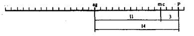 Ген Р отстоит от гена aq на 14 морганид. Но мы не знаем, вправо от него или влево. Из условий выясняем, что Р расположен от ms. на 3 морганиды. Вопрос: вправо или влево от него? Расстояние между aq и ms равно 11 морганидам, а между aq и Р— 14 морганидам. Следовательно, ms расположен между aq и Р. Поэтому отмечаем точку Р вправо от aq на 14 морганид и вправо же от ms на 3 морганиды.