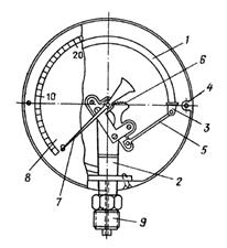 По мере развития промышленности, особенно в связи с появлением паровых машин и железных дорог, потребовались более удобные, чем жидкостные манометры приборы. Деформационные манометры содержат упругие чувствительные элементы, осуществляющие преобразование давления в пропорциональное перемещение рабочей точки этого элемента. Рабочий диапазон выбирается в области упругих деформаций с обеспечением запаса на случай перегрузки чувствительного элемента. Первый деформационный манометр с трубчатым чувствительным элементом был изобретен случайно. Рабочий, при изготовлении змеевика для дистилляционного аппарата, сплющил поперечное сечение цилиндрической трубки, изогнутой по спирали. Тогда, чтобы восстановить форму трубки, один конец ее заглушили, а в другой конец насосом дали давление воды. При этом часть трубки с деформированным сечением приняла цилиндрическую форму, а спираль на этом участке разогнулась. Этот эффект был использован немецким инженером Шинцем, который в 1845 г. применил трубчатый чувствительный элемент для измерения давления. Промышленное производство трубчатых деформационных манометров было организовано французским фабрикантом Бурдоном, получившим в 1849 г. патент на изобретение одновитковой трубчатой пружины, именем которого она до сих пор часто называется («трубка Бурдона»). В 1850 г. Примавези и Шеффер изобрели мембранный манометр, а несколько позже в 1881 г. Клейманом получен патент на сильфонный манометр. В зависимости от типа применяемого чувствительного элемента деформационные манометры разделяются на трубчато-пружинные, сильфонные и мембранные. 1. Трубчато-пружинные манометры В трубчато-пружинных манометрах в качестве чувствительного элемента применяется трубчатая пружина, которая может быть выполнена одновитковой или многовитковой. На рис. 2.5 показан одновитковый манометр, который посредством ниппеля 9 соединяется с объемом измеряемой среды, к внутренней стороне ниппеля прикреплена изогнутая по определенному радиусу пустотелая трубка 1 овального сечения. Свободный конец трубки 1 запаян и соединен с показывающим механизмом 3. Под действием сил давления трубка 1 раскручивается на величину, пропорциональную давлению.