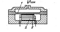 Рис. 2.9 Схема пьезоэлектрического манометра Измеряемое давление с помощью мембраны 1 преобразуется в усилие, сжимающее кварцевые пластины 2. Электрический заряд, возникающий на металлизированных плоскостях 3 под действием усилия F со стороны мембраны 1, определяется выражением