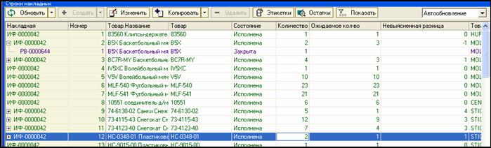 Далее, по мере сканирования и выгрузки данных, бухгалтер магазина исполняет накладные «Факт инвентаризации» (НФ), переводя их из состояния «Новая» в состояние «Исполнена». После исполнения накладных «Факт инвентаризации» (НФ) в накладной «Инвентаризация по факту» (ИФ) в колонке «Количество» проставляется количество отсканированных товаров (это то, что было отсканировано инвентаризационными бригадами).