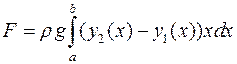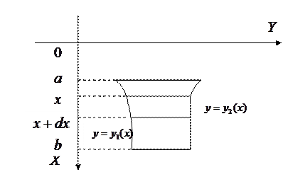 греблю чи шлюз, тощо. Оберемо систему координат так, щоб її початок знаходився на вільній поверхні рідини, вісь була спрямована перпендикулярно до вільної поверхні вглиб рідини, а плоска фігура, силу тиску на яку потрібно обчислити, лежала в площині . Нехай ця фігура обмежена лініями і та прямими і , де функції і неперервні на відрізку .