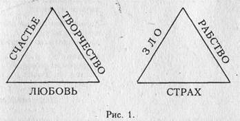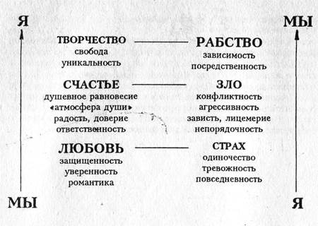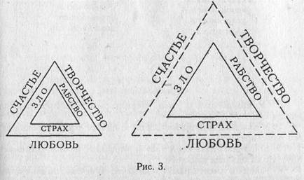 Несколько слов о том, почему взяты именно эти понятия: ЛЮБОВЬ-СТРАХ, СЧАСТЬЕ-ЗЛО, ТВОРЧЕСТВО-РАБСТВО. Да потому, что они все взаимосвязаны. Любовь рождает счастье, которое находит себя в творчестве, а страх порождает зло, которое приводит к рабству. Итак, у человека: чем больше любви, тем меньше страха; чем больше счастья, тем меньше зла; чем больше творчества, тем меньше рабства. И это очень личное...