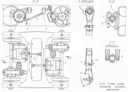 Тяговый двигатель связан с поперечными балками рамы в трех опорных точках – двух верхних и одной нижней. Узел крепления на верхних кронштейнах представляет собой шарнир в виде цилиндрического стержня, запрессованного в приливы корпуса двигателя, который отделен от стенок кронштейна рамы и крышки резинометаллическими прокладками. Каждая прокладка состоит из стальной армировки, слоя формовой резины и центрирующего штифта диаметром 9 мм, который входит в глухое отверстие по центру кронштейна. На месте тяговый двигатель будет удерживаться при помощи двух крышек, опорные плоскости которых также имеют полукруглые выемки, соответствующие диаметру стержня, и в которые тоже вложены две компенсирующие прокладки. Этими крышками стержень накрывается сверху и каждая крышка стягивается при помощи четырех болтов, вворачиваемых в специальные сухари. Сухари попарно соединяются осями-шпильками, а они контрятся шплинтами. От самопроизвольного откручивания болты удерживают пластинчатые шайбы, попарно контрящие головки болтов. В боковых ребрах остова тягового двигателя имеются сквозные резьбовые отверстия под регулировочные боты с контргайками, при помощи которых производится регулировка разбега карданной муфты. Нижний узел крепления двигателя выполнен в виде реактивной тяги, которая соединяет нижний кронштейн на остове тягового двигателя с кронштейном на соседней поперечной балке рамы тележки.