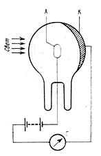 Приборы, в основе принципа действия которых лежит явление фотоэффекта, называют фотоэлементами. На внешнем фотоэффекте основан важный физико – технический прибор, называемый вакуумным фотоэлементом (рис. 3). Катодом – К служит слой металла, нанесенный на внутреннюю поверхность эвакуированного стеклянного баллона В; G – гальванометр; Анод – А выполнен в виде металлического кольца, помещенного в центральной части баллона. При освещении катода в цепи фотоэлемента возникает электрический ток. Сила которого пропорциональна световому потоку. Большинство современных фотоэлементов имеет сурьмяно – цезиевые или кислородно – цезиевые катоды, обладающие высокой фото чувствительностью. Кислородно – цезиевые чувствительны к ИК – излучению и видимому свету (к=(20 Для увеличения чувствительности фотоэлемента его наполняют аргоном при давлении 1 Па. Фототок в таком фотоэлементе усиливается вследствие ионизации аргона,вызванной стояк, ношениями фотоэлектронов с атомами аргона. Фото чувствительность газонаполненных фотоэлементов составляет около 1 мА/лм. Основное техническое применение фотоэлементы находят фототелеграфии (передача изображения на расстояние по проводам), в телевидении и в звуковом кино (для воспроизведения звука). Кроме того, фотоэлементы широко применяются в фотореле. В фотореле использована безынерционность фотоэффекта, т.е. способность фотоэлемента практически мгновенно реагировать на световое воздействие или его изменение. Оно может работать либо при попадании света на элемент, либо при прекращении освещения фотоэлемента. Фотореле может в нужное время включать и выключать уличные фонари в городах, свет маяков, сортировать различные детали по цвету и форме, пускать в ход или останавливать электродвигатели, станки и т.д. Широко применяются фотоэлементы в аэронавигации, в военном деле, чувствительные к ИК – лучам. ИК – лучи не видимы, облака и туман для них прозрачны. Сочетание фотоэлемента с вторичной электронной эмиссией применяется в фотоэлектронных умножителях (ФЭУ): слабый пучок фотоэлектронов, ускоряясь, попадает на ряд катодов, выбивая из каждого вторичные электроны и лавинообразно усиливаясь. Усиление 9 –каскадного ФЭУ достигает