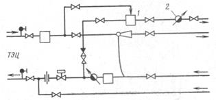 Центральные тепловые пункты применяются в жилых микрорайонах при закрытой системе теплоснабжения ввиду отсутствия в типовых жилых зданиях подвалов для размещения ИТП. Последние, кроме того, являются источниками шума от работающих насосов и другого оборудования при плохой звукоизоляции перекрытий над подвалами зданий (при их наличии). Применение ЦТП упрощает эксплуатацию системы теплоснабжения за счет уменьшения приборов учета и контроля, сокращает численность персонала. Однако в микрорайонах возникает необходимость прокладки дополнительных теплопроводов от ЦТП до отдельных зданий. Целесообразность и мощность ЦТП, т. е. количество ЦТП для данного жилого района, определяются технико-экономическим расчетом. Стоимость внутриквартальных сетей от ЦТП до отдельных зданий при разукрупнении ЦТП уменьшается, но растет стоимость распределительных тепловых сетей между ЦТП. Общая стоимость распределительных и внутриквартальных сетей остается примерно одинаковой, а возрастание количества ЦТП удорожает систему теплоснабжения. Схема центрального теплового пункта отличается от приведенного на рис. 6 индивидуального теплового пункта только размерами оборудования и отсутствием элеватора. В ряде случаев в ЦТП добавляется устройство по обработке водопроводной воды, идущей на горячее водоснабжение. Элеваторные узлы при наличии ЦТП монтируются в каждом здании перед отопительной системой (в последнее время на каждой фасадной стороне здания). На элеваторных узлах, расположенных в зданиях, отсутствуют водомеры и регуляторы расхода, которые устанавливаются на ЦТП.