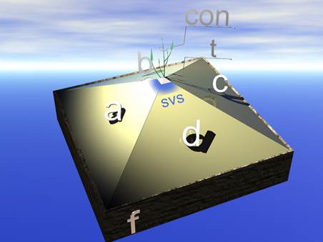 - Основание, ее фундамент (fundament); - Центральная ось (conscious, t-время); - Вершина (apex). - Грани Пирамиды: - Личность или «власть» (a) - Социум (b) - Экология (c) - Экономика (d)