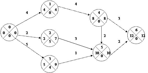 1 Путь сетевого графика Путь - это продолжительность всех работ, которые выполняются между двумя событиями. Имеется несколько вариантов путей. Полный путь - сумма путей между исходным (начальным) и завершающим (конечным) событием данного сетевого плана. Критический путь - максимально длинный из возможных путей между начальным и конечным событиями. В проекте может быть несколько критических путей одинаковой длины. Резервом времени любого пути называется разность между продолжительностью критического и рассматриваемого пути 2. Расчет временных характеристик работ Работа – это действие в результате которого образуется некоторое событие или события. Работы бывают действительными, ожиданиями и фиктивными. Действительная работа требует затрат времени и ресурсов (человеческих и материальных). Во время ожидания требуется только затраты времени. Действительная работа и ожидание обозначается стрелкой. Фиктивная работа не требует ни времени, ни ресурсов. Фиктивная работа обозначается прерывистой стрелкой и всегда на сетевом графике равна нулю. К временным характеристикам работ относятся: ранний срок начала работы, ранний срок окончание работы, поздний срок начала и поздний срок окончания работ, резерв времени. Ранний срок начала любой работы сетевого графика (tр.н.) равен суммарной продолжительности работ на максимальном из предшествующих этой работе путей. Ранний срок окончания любой работы сетевого графика (tр.0.) равен сумме раннему сроку начала работы и ее продолжительности. Поздний срок окончания любой работы сетевого графика (tп.0) равен разности между продолжительностью критического пути и суммарной продолжительностью работ на максимальном из путей, следующих за данной работой к завершающему событию. Поздний срок начала работы сетевого графика (tрн.) равен разности между поздним сроком окончания этой работы и продолжительностью самой работы. Резервом времени работы (R) называется предельное время, на которое можно увеличить продолжительность данной работы, не изменяя продолжительности критического пути. 3. Расчет временных характеристик события Событие - это результат нескольких работ, после которой можно начинать одну или несколько последующих работ. Расчет временных характеристик событий производится с целью контроля за ходом создания системы. Расчет производится секторными методами при этом каждое событие разбивается на 4 сектора: