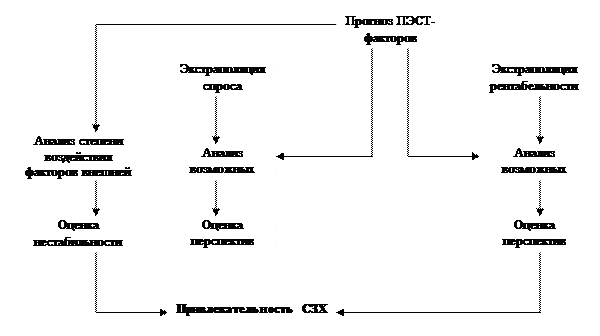 Данная оценка необходима при усложнении перспектив роста и условий конкуренции. В нестабильных условиях, когда длительность фаз жизненных циклов спроса и технологии становится короче, чем временной горизонт внутрифирменного планирования, перспективы СЗХ следует измерять по нескольким критериям. 1. Чтобы учесть возможное воздействие жизненного цикла, нужны две оценки роста: одна – для непройденной части текущей фазы, а другая – для следующей фазы. 2. Из-за возможности изменений в развитии конкуренции не следует строить предположений о том, что рентабельность, присущая данной СЗХ, останется неизменной или будет находиться в положительной зависимости от дальнейшего роста. Поэтому нужны две, независимые друг от друга оценки рентабельности: краткосрочная и долгосрочная. 3. В связи с возможными изменениями в социальных, политических, экономических, технологических условиях при оценке степени привлекательности следует учитывать уровень будущей нестабильности. Таким образом, вместо одного показателя роста объема, применяемого в Бостонской матрице, оценка привлекательности СЗХ требует сложной комбинации факторов. Промышленные фирмы и фирмы-консультанты по вопросам управления разработали различные приемы оценки привлекательности СЗХ. Принципы такого подхода показаны на рис.11.2. Оценка привлекательности СЗХ осуществляется последовательно: 1. Оценка начинается с глобального прогноза экономических, социальных, политических, технологических условий для тех СЗХ, которые интересуют организацию. Начиная с 50-х годов разработан большой набор методов прогнозирования условий деятельности. Среди них наибольшую популярность к настоящему времени получил метод разработки сценариев будущих условий.