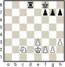Ход на первый взгляд непонятный. Rh2, И теперь белый король снова покидает свое убежище: 2. Kf7 Rf2+ 3. Kg6 Rg2+ 4. Kf6! Rf2+ 5. Kg5 Rg2+ 6. Rg4! Постройка моста закончена – поле g5 сделалось превосходным убежищем. После 4. Kf6! черные могли бы подождать с дальнейшими шахами, играя, например, 4...Rg1, но тогда следует чудесный маневр, которому позавидует всякий инженер: мы переносим весь мост со всеми его принадлежностями с одного места на другое – играем 5. Rе5!! и строим мост над полем g5; тогда убежище будет находиться на g6. Этот восхитительный прием принадлежит к числу обыденнейших маневров – доказательство удивительной красоты шахматной игры! Интересно было бы выяснить, не могут ли белые сыграть сразу 1. Rе5. Оказывается, могут; этот ход тоже выигрывает, однако менее убедительно, чем «авторское решение» – 1. Rе4. На 1. Rе5 следует: 1...Kd6 2. Kf7 Rf1+ 3. Kе8 (но не 3. Kg6? Kxе5 4. g8Q Rg1+ и т.д.) 3...Rg1 4. Rе7 Rа1 5. Rd7+ или 4...Rg2 5. Kf8 Rg1 6. Rf7, и белые выигрывают. Постройка мостов с целью создания убежища для короля является типичной составной частью стратегии эндшпиля и тесно связана с маневром, который мы рассмотрим ниже, в пункте 3. Такой мост мы, в частности, уже видели в партии № 10 (см. диаграмму после 35-го хода черных), где перевод коня на f5 создал для короля убежище на поле f3.