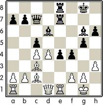 Мотив связывания посредством Bc1–g5 или Bс8–g4 оказывается как бы исключенным навсегда. 8. Nc3 c6 9. Ne2 Re8 (игра по линии «е») 10. Ng3 Ne4 11. Nh5 Nd7 12. c3 Ndf6 13. Nh2 Qc7 14. Nxf6+ Nxf6 15. Nf3 Ne4 16. Bc2 Bf5 17. Nh4 Bh7 18. Be3 g5 19. Nf3 f5 20. Re1 Re7 21. Nd2 f4 22. Nxe4 dxe4 23. Bd2 Rae8 24. c4 c5 25. Bc3 Bg6