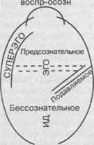 Ид, эго и суперэго функционируют на различных уровнях осознавания, что Фрейд пытался графически представить в виде диаграммы, изображенной на рис. 11.2 (Freud, 1933). Ид, расположенное в нижней части рисунка, никак не соприкасается с областью, обозначенной как «воспр—осозн» — воспринимаемой и осознаваемой частью реальности. Ид целиком принадлежит сфере бессознательного — это означает, что его работа может стать осознаваемой лишь в результате значительных усилий. Эго уже проникает в область осознавания и реальности — это особая часть ид, которая развивается, чтобы контактировать с внешним миром. Обратите внимание, что эго занимает преимущественно область, обозначенную как предсознательное (preconscious). Этот термин обозначает функционирование на уровне более низ-рсом, чем уровень осознавания, но который становится доступным для осознавания в результате приложения относительно небольших ^усилий. Эго также частично относится к бессознательному уровню, 4 частности, процесс подавления запретных мыслей со стороны эго происходит полностью бессознательно. Суперэго помещено на рисунке выше уровня эго, что символизирует исходящую сверху критикующую функицю суперэго по отношению к эго. Суперэго также частично является бессознательным: хотя мы в ряде случаев осознаем руководящие нашими поступками моральные нормы, они также часто оказывают свое воздействие без нашего осознавания. Например, мы можем испытать внезапную депрессию, причин которой мы не понимаем — это происходит вследствие того, что суперэго наказывает нас за недозволенные мысли.