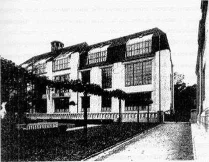 X. ван де Вельде. Здание художественной школы в Веймаре. 1904-1911; с 1919 по 1923 год в этом здании размещался Баухауз В. Гропиуса В 1900-1902 годы ван де Вельде выполнил проект внутренней планировки и отделки интерьеров Фолькванг-музея в Хагене, ставший типичным образцом искусства модерна. После окончания этой работы последовало его приглашение в качестве советника по делам искусств при дворе Великого герцога в Веймар, где он открыл Высшую школу прикладных искусств, которой руководил вплоть до своего отъезда в 1917 году в Швейцарию. По его проекту было построено новое здание школы, в котором позднее расположится Веймарский Баухауз. Постройка отличалась от того, что он делал ранее. Это - прямоугольное в плане сооружение, его боковые стены прорезаны широкими вертикальными рядами окон, заканчивающимися на крыше фонарями мастерских. В отделке здания ван де Вельде сделал попытку освободиться от излишнего декора, орнамента и причудливых волнообразных линий, отличавших его прежний стиль. В целом период работы ван де Вельде в Германии оказался временем наивысшего расцвета его творчества. Он сумел проявить себя в разных ипостасях: опытным архитектором, талантливым педагогом, блестящим теоретиком искусства. Особую известность получила речь ван де Вельде в 1914 году в Кельне на открытии выставки немецкого «Веркбунда». Текст этого выступления и по сей день остается одним из важнейших программных документов того времени. Подводя итоги развития стиля модерн, и отвечая своим оппонентам, сторонникам типизации и стандартизации в архитектуре, ван де Вельде заявил: «До тех пор художники Веркбунда будут иметь влияние, пока будут протестовать против любого предлагаемого им канона и любой типизации. Каждый художник - пламенный индивидуалист, свободный, независимый творец. Добровольно он никогда не подчинится дисциплине, которая навязывает ему какой-либо тип или канон»54. Эти слова ван де Вельде свидетельствуют о том, что уже тогда он сумел предвидеть важный конфликт, прошедший и через всю историю Баухауза -конфликт между свободным творческим самовыражением, с одной стороны, и поиском формального языка, продиктованного потребностями массовой продукции, с другой. В пределах нашего краткого обзора духовных и социально-исторических линий развития, перекрещивающихся в Баухаузе, необходимо обратиться к истории создания Дармштадской колонии художников, которая явилась определенной вехой на пути к созданию Баухауза. Художественная колония на Матильденхое была образована в 1898-1899 годы по инициативе известного мецената и коллекционера произведений искусства, немецкого герцога Эрнста Людвига фон Хессена, пригласившего в Дармштадт с целью возрождения художественных ремесел семь художников во главе с Й. Ольбрихом и П. Беренсом. Герцог выделил мастерам землю, предложив застроить ее, что было сделано не только из меценатских побуждений, но и для того, чтобы художники смогли подействовать наглядно, а также непосредственно педагогически»55. Австрийский архитектор Йозеф Мария Ольбрих (1867-1908) был одним из первых художников, приглашенных герцогом для предстоящей работы в Дармштадте. Он получил образование в государственной промышленной школе, в Венской академии художеств, а затем в специальной архитектурной школе К. фон Хазенауэра и О. Вагнера. После окончания 