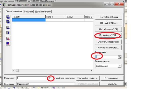 Д) Файл загружаем в КАЖДЫЙ ТСД (примерно 20 минут на 1 ТСД), для этого подключаем ТСД через кабель к USB разъему на компьютере, ТСД переводим в режим Обмен данными (п.7 на рис. «Меню ТСД»), запускаем программу «Драйвер ТСД»: ставим галочку в поле «Устройство включено», выбираем номер справочника «0», нажимаем кнопку «Из файла в ТСД» (см. рис. «Драйвер ТСД»), Рисунок «Драйвер ТСД»