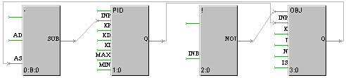 Далее следует выполнить следующую последовательность действий: - выбрать функциональный раздел Арифметические; - выбрать блок вычитания (-) и разместить его нажатием ЛК в рабочем поле; - выбрать функциональный раздел Регулирование; - выбрать блок (PID) и разместить его в рабочем поле; - выбрать функциональный раздел Логические; - выбрать блок (!) и разместить его в рабочем поле; - выбрать функциональный раздел Регулирование; - выбрать блок OBJ и разместить его в рабочем поле. Далее следует перейти в режим редактирования связей. Теперь следует связать входы и выходы размещенных блоков, как показано на рисунке 8. Для соединения входа одного блока с выходом другого надо сначала выделить с помощью ЛК этот вход, затем снова нажать ЛК (при этом будет слышен звуковой сигнал) и, удерживая ее, переместить курсор в область второго конца связи. Для уничтожения связи следует выделить ее со стороны входа блока и нажать клавишу DEL. 9 Далее следует описать переменные и константы данной программы. Для описания любой переменной программы следует дважды нажать ЛК на вкладку программы Аргументы