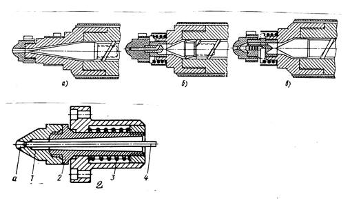 Рис. 4.3. Инжекционные сопла термопластавтоматов: а – открытое (для вязких материалов); б – открывающиеся при упоре в литниковую втулку формы; в – открывающиеся под давлением материала; г – самозапирающееся инжекционное сопло: 1 – головка сопла; 2 – втулка; 3 – пружина; 4 – игольчатый клапан (а – канал головки сопла 1)