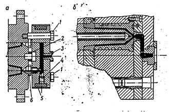 части формы с помощью специальных болтов, которые одновременно являются направляющими продольного движения камеры. Это движение (на 2÷3 мм) осуществляется за счет тарельчатых пружин при отводе инжекционного цилиндра от машины. При движении камеры нарушается контакт горячеканальной камеры с охлаждаемой формой в промежутке между впрысками. Разводящие каналы находятся в корпусе камеры. “Пассивная” литниковая камера (рис. 4. 37б)не имеет специального обогрева, но материал в ней сохраняет вязко-текучее состояние в промежутках между впрысками за счет большого сечения разводящих каналов в камере (~ 100 мм2). Камера применяется при коротких циклах литья (15÷20 с). Достоинства горячеканальной технлогии: 1. Полное отсутствие литниковых отходов. 2. Исключена операция отрыва литника от изделия. 3. Расплав полимера предельно приближен к формообразующей камере, что способствует повышению качества изделий. 4. Это же обстоятельство позволяет получать крупные по размеру изделия (пластмассовая мебель) с минимальной толщиной стенки и, следовательно, более эффективно использовать дорогостоящий полимерный материал. Недостатки: 1. Ассортимент перерабатываемых полимеров ограничен требованиями термостабильности. 2. Расплав полимера должен быть маловязким (ПТР > 8 г/10 мин). 3. Инжектирование расплав требует увеличения усилия впрыска в пластикаторе. 4. Горячий блок формы оснащен высокоточными устройствами терморегулирования и управления. 5. Конструкция, устройство и обслуживание формы существенно сложнее по сравнению с холодноканальными. Все это является причинами высокой стоимости горячеканальных форм, применение которых требует тщательного технико-экономического обоснования (тиражность изделий, их рыночная стоимость, продолжительность спроса и др.).