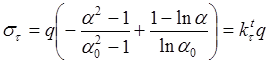 Следовательно максимальное давление не вызывающее пластических деформаций составляет 0.6 от предела текучести. Если же вместо Опыт показывает, что сосуды выдерживают значительно большие давления Это объясняется следующим образом. Когда напряжение в металле Внутренний слой в пластическом состоянии При росте Цилиндр высокого давления будет разделён как бы на два слоя: внутренний (пластический), наружный (упругий), который предохраняет внутренний от разрыва. По мере увеличения Эксперименты подтверждают - разрыв начинается снаружи! Исследования показали, что как только в цилиндре возникает пластическая деформация, то даже в отсутствии осевых нагрузок напряжённое состояние становится трёхосным. Происходит процесс, подобный выдавливанию внутренних слоёв в осевом направлении. При этом внешние слои препятствуют развитию этого процесса и, в результате взаимодействия внешней упругой и внутренней пластической зон в них возникают растягивающие и сжимающие напряжения. Радиальные напряжения и деформации максимальны на внутренних слоях и минимальны на внешней поверхности. Кольцевые напряжения максимальны на границе упругой и пластической зон. При существовании в стенке этих двух зонво внутренних слоях цилиндра напряжённоще состояние близко к двухосному сжатию, а во внешних - к одноосному растяжению. Этим и объясняется, чо разрыв цилиндра начинается с наружной поверхности. В зоне пластических деформаций значение эквивалентных напряжений не зависит от давления - горизонтальный участок. В этом случае материал стенки используется гораздо лучше при работе в области упругих деформаций. В результате упрочнения, вызванного пластической деформацией, материал способен выдерживать более высокие давления. Давление, при котором пластический слой распределён на всю толщину стенки: