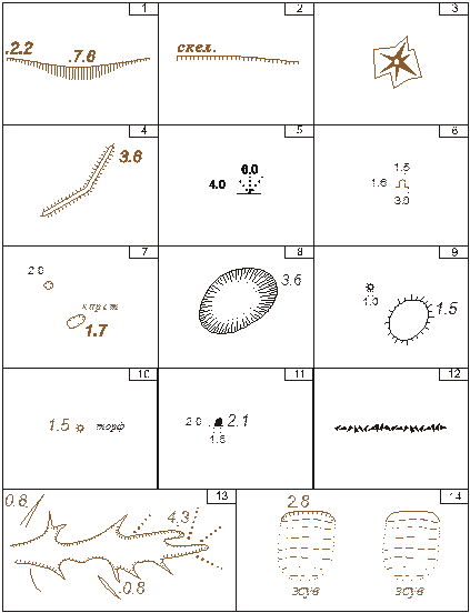 Рис. 43. Приклади умовних позначень рельєфу для масштабів 1:500 – 1:5000: 1 – обриви земляні; 2 – обриви скелясті; 3 – скелі-останці; 4 – дайки; 5 – виходи підземних газів; 6 – входи в печери та гроти; 7 – вирви карстові і псевдокарстові; 8 – ями; 9 – кургани; 10 – природні горби-орієнтири, що не виражаються горизонталями; 11 – окремі камені-орієнтири; 12 – вали із каміння; 13 – яри та промоїни; 14 – зсуви