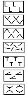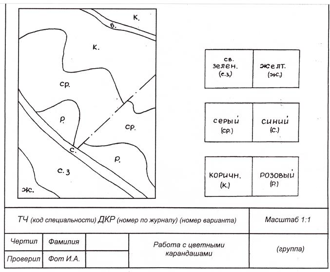 Гипсометрическая раскраска применяется для большей наглядности изображения неровностей земной поверхности на картах и выполняется, как правило, различными оттенками трёх цветов: голубым - рельеф дна морей и крупных водоёмов, зелёным - рельеф низменностей и коричневым - горный рельеф. Для того, чтобы производить гипсометрическую раскраску, строят шкалу высот в виде столбика и заранее устанавливают число ступеней и их расцветку. Раскраску шкалы высот строят по принципу: чем выше, тем темнее, или наоборот. Для получения различных оттенков одного и того же цвета прямоугольники закрашивают разным количеством слоев. Например, для получения светло-синего оттенка бумагу окрашивают одним слоем, синего - двумя, а тёмно-синего - тремя, четырьмя слоями. Ход работы: 1. Начертите рамку. Поля: левое - 20 мм, нижнее и правое — 5 мм, верхнее - 5 мм. 2. Начертите 3 квадрата со сторонами 48 мм. Разделите каждый квадрат на 4 прямоугольника со сторонами 12 х 48 мм (см. образец). 3. Начертите 3 перекрывающих друг друга квадрата со сторонами 55 мм (см. образец). 4. Начертите 3 квадрата со сторонами 48 мм. Разделите каждый квадрат на квадраты со сторонами 12 мм (см. образец). 5. Выполните фоновую и гипсометрическую раскраску геометрических фигур. 6. Оформите штамп. 7. Вычертите в туши в том порядке, в котором происходило вычерчивание чертежа карандашом.