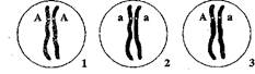 Рис. 1.1 Локализация пары аллелей в гомологичных хромосомах: 1 — гомозигота доминантная —АА; 2 — гомозигота рецессивная —аа; 3 — гетерозигота —Аа.