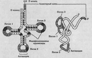 Рис. 2.3. Строение тРНК. В 1970-х годах Сидней Альтман и Томас Чек сделали открытие, противоречащее традиционным представлениям. Они показали, что РНК не только является переносчиком информации с ДНК, но и выступает в роли катализатора в ряде клеточных процессов. Каталитическая способность РНК позволила использовать эту молекулу для различных биотехнологических целей, в частности для борьбы с вирусными инфекциями.