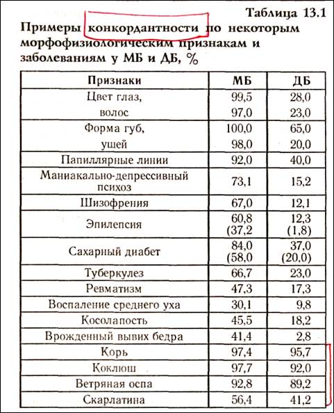 Коэффициент «К» можно выражать в процентах и в долях единицы. Если у монозиготных близнецов «К» высок, а у дизиготных — низок, считают, что доминирующая роль в определении признака принадлежит наследственным факторам. При близких значениях «К» у моно- и дизиготных близнецов считают, что признак развивается в основном под действием внешней среды. Если значение «К» у монозиготных близнецов невысоко, но существенно выше, чем у дизиготных близнецов, считают, что в формировании признака сыграли роль как факторы внешней среды, так и факторы генетической природы, т.е. к развитию признака имеется определенная наследственная предрасположенность (табл. 13.1). Для объективности суждения о роли среды и наследственности в развитии признака используют критерий «Н» — наследуемость.