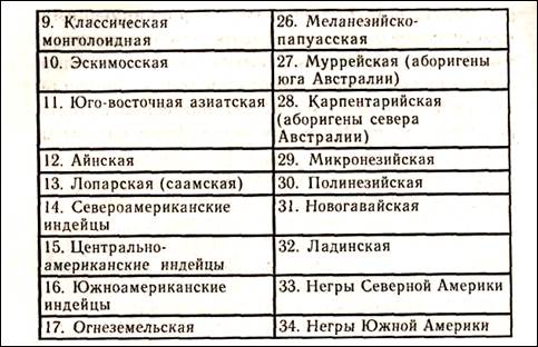 Расы определяют как популяции одного и того же вида, несколько отличающиеся в генетическом отношении, но репродуктивно не изолированные друг от друга. Расы не обязательно представляют собой новые виды, так как процесс расовой дифференциации является обратимым. У человека расовая дифференциация сглаживалась на протяжении нескольких последних столетий за счет межрасовых браков и миграции населения. Для образования рас необходимо, чтобы поток генов не был интенсивным, иначе расы сливаются и формируется единый генофонд. К. Липнем были выделены разновидности четырех рас человека (африканская, азиатская, американская и европейская). В 1775 г. Блуменбах выделил 5 наиболее известных «цветных» рас человека: • белую, или кавказскую (или европеоидную); • желтую, или монгольскую (или монголоидную); • черную, или эфиопскую; • красную, или американскую; • коричневую, или малайскую. Хотя расы выделены только по цвету кожи, но этнические группы различаются по многим другим признакам, например, черты лица, строение волос, телосложение и т.д. (табл. 13.8).