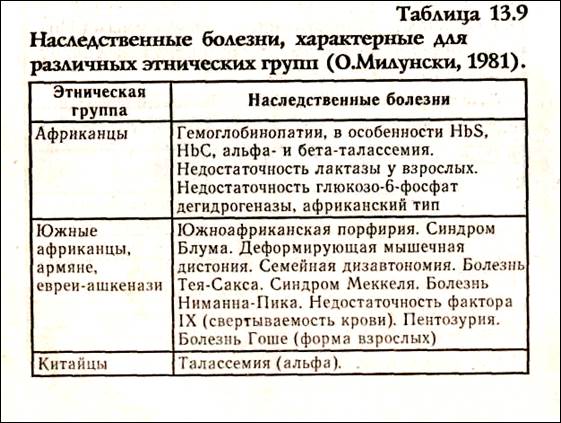 Популяционно-генетические исследования показали, что распределение наследственных болезней среди различных рас и народностей в различных странах неравномерно (табл. 13.9, 13.10).
