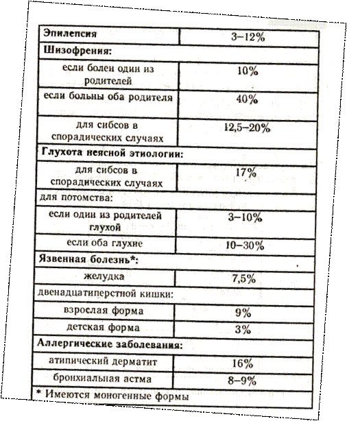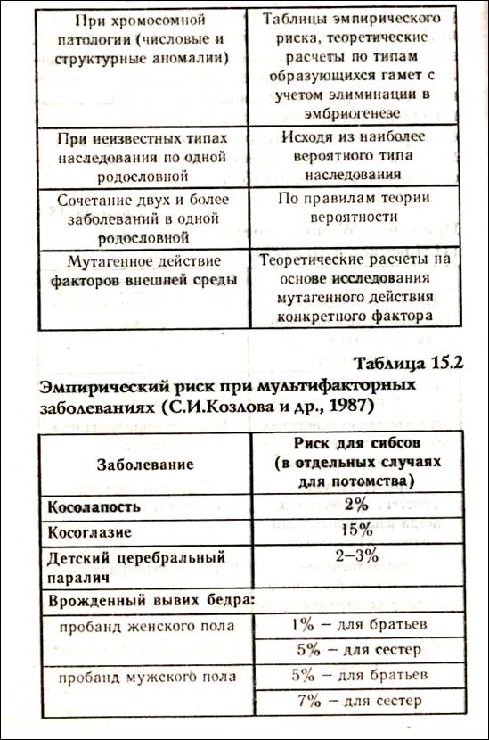 Основной целью медико-генетического консультирования является предупреждение рождения ребенка с тяжелыми наследственными заболеваниями, а также консультирование по проблемам планирования семьи. По данным Всемирной организации здравоохранения, в 1990 г. из 10 новорожденных 9 родились с различной степенью генетических патологий и только 1 ребенок из 10 родился «абсолютно» здоровым. И даже если в первое время проявление патологий незаметно, они дадут себя знать подверженностью аллергиям, частыми простудами, сколиозом, астмой или неврозами. А позднее, уже став взрослыми, эти бывшие физиологически незрелые дети будут первыми кандидатами на атеросклероз, диабет, ишемическую болезнь или рак. Первый кабинет по МГК был организован в 1941 г. Дж.Нил в Мичиганском университете (США). В нашей стране в 1932 г. под руководством профессора С.Г. Левита был создан медико-генетический институт, в котором исследовали генетическую природу различных наследственных болезней. Первые медико-генетические кабинеты в России были организованы в Москве и Ленинграде в 1967 г., а с 1970 г. такие кабинеты были организованы при всех республиканских, краевых и областных больницах. В мае 1973 г. кабинет МГК был открыт в Ростове-на-Дону. 15.1. Этапы консультирования Первый этап консультирования начинается с изучения анамнеза болезни, составления генеалогической карты (см.раздел 13.1) и уточнения клинического диагноза, с помощью проведения цитогенетических и биохимических исследований. В некоторых случаях проводят дополнительное обследование родителей, включающее, как правило, дерматоглифическое, цитогенетические исследования (оценка кариотипа родителей: забор периферической крови или соскоб слизистой рта и последующий скрининг хромосом, оценка кариотипа плода с использованием амниоцентеза). Второй этап консультирования — если диагноз уточнен, врач-генетик прогнозирует вероятность рождения больного ребенка. В табл. 15.1: приведены основные варианты генетических задач по оценке риска наследственных болезней. При анализе родословной возможны следующие ситуации, требующие различного подхода: Моногенно наследуемая патология, при которой повторность болезни среди родственников позволяет выяснить тип наследования в данной семье. В этих случаях вычисляют теоретический риск рождения больного ребенка. Полигенно наследуемая патология. Болезнь встречается в различных поколениях у пробанда, но методы теоретического расчета неприменимы, и риск устанавливается на основе эмпирических данных. Такие полигенные болезни, как шизофрения, эпилепсия и др., встречаются часто, о них накоплен достаточный фактический материал, на основе которого рассчитан эмпирический риск, созданы специальные таблицы, где данные риска рассчитаны в зависимости от состояния здоровья родителей уже родившихся детей и других родственников и т.д. (табл. 15.2).