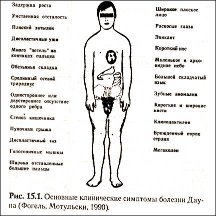 Хромосомные болезни. При аномалиях половых хромосом повторные случаи любой из них в семье исключительно редки. При синдромах XXY и XXX обнаруживается связь с возрастом матери. Наиболее неблагоприятным будет прогноз при транслокациях в тех случаях, когда в гаметах одного из родителей имеется сбалансированная хромосомная мутация (см.раздел 12.2.3). Риск рождения ребенка с синдромом Дауна (трисомия по 21-й хромосоме) увеличивается, если возраст матери превышает 35 лет (табл. 15.3). Больные с синдромом Дауна обычно невысокого роста, отличаются слабоумием и многочисленными физическими пороками (табл.15.4, рис.15.1).