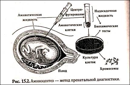 Для определения кариотипа плода необходимо получить 15-20 мл околоплодных вод. Клетки плода из полученной жидкости выращивают в культуральной среде в течение 2 недель. Затем по специальной методике приготавливают пластинки с метафазными хромосомами и проводят цитоге-нетический анализ клеток плода. Если при амнио-цеитезе выявляются серьезные нарушения, такую беременность рекомендуют прекратить. Анализ амниотической жидкости особенно важен при беременностях, сопряженных с высоким риском (особенно в случаях, когда оба родителя — носители одного и того же рецессивного гена). Амниоцентез необходим, если возраст матери превышает 35 лет, когда сильно возрастает вероятность патологий, связанных с нерасхождением хромосом в мейозе. Существуют и другие методы пренатальной диагностики. Ультразвуковое исследование (УЗИ) основано на способности ультразвуковой волны отражаться от поверхности раздела двух сред, отличающихся разной плотностью, что позволяет получить их изображение на экране. Фетоскопия — метод визуального наблюдения плода в полости матки через эластичный зонд, оснащенный оптической системой.
